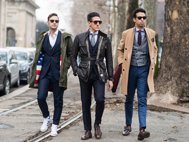 De manera que hoy, a grandes rasgos, hemos venido a parar a un oasis de buen gusto. Trajes tallados de colores clásicos, recuperando el cuerpo humano como patrón. Perneras ceñidas, pantalones con vuelta y bajos a la altura del tobillo, evitando esos terribles pliegues de acordeón sobre el empeine de los zapatos y dejando atisbar calcetines vistosos. Camisas de cuellos discretos, corbatas delgadas con nudos sencillos. Slim fit, tallas ajustadas, todo pegado al cuerpo, lejos de tentaciones ostentosas. En un nivel más alto, el suave revival de ‘Mad Men’ que tiene a Don Draper como icono de una poderosa virilidad estoica y manhattanesca.